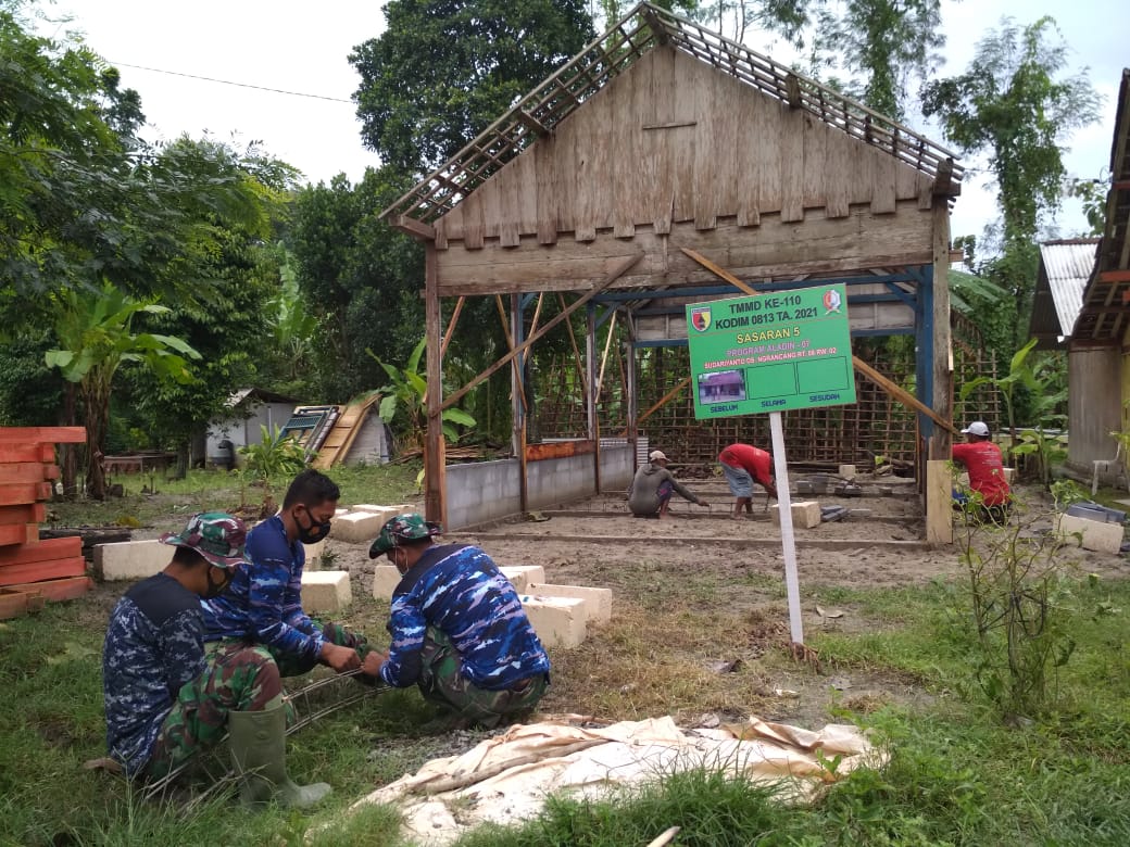 Bojonegoro – Anggota Satgas TNI Manunggal Membangun Desa (TMMD) Ke- 110 Kodim 0813/ Bojonegoro bergotong royong bersama warga sekitar bangun rumah Desa Ngrancang Kecamatan Tambakrejo Kabupaten Bojonegoro.