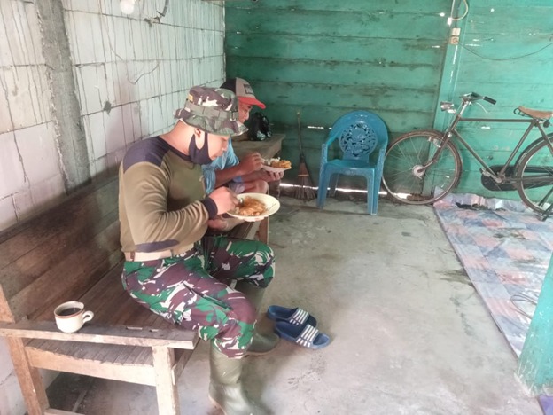 “Sarapan pagi adalah hal yang akan membuat badan kita kuat untuk mengerjakan pengerjaan renovasi rumah ini,” Serka Imron anggota satgas TMMD sambil menyantap sarapan pagi.