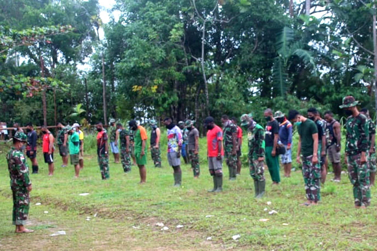 MERAUKE – Serma Kadariono, selaku Kepala Tukang Satgas TMMD ke-112 Kodim 1707/Merauke, memimpin kegiatan apel pengecekan personel, di Kampung Okor Distrik Haju Kabupaten Mappi, Selasa 21/9/2021.