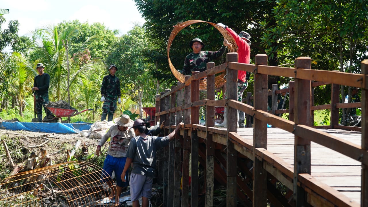 Serda Taufik bersama anggota satgas lainya tampak mengangkat besi tersebut agar bisa di letakan di dalam perahu kayu. Dengan jiwa kekompakan secara bergotong royong akhirnya besi berhasil di naikan. Kegiatan tersebut dilakukan karena jalur darat tidak memungkinkan untuk membawa anyaman besi sebesar itu.