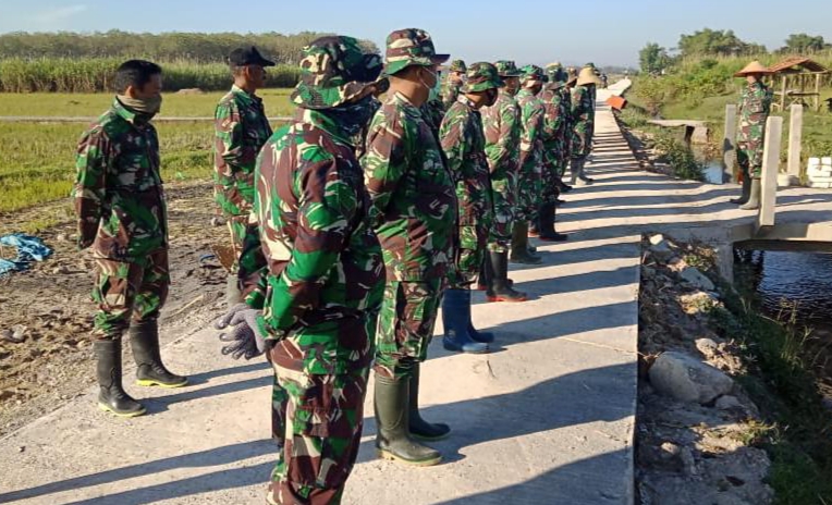 Terlihat ada yang beda dalam pelaksanaan apel pagi kali ini. Apel di laksanakan di badan jalan yang sudah dilakukan pengecoran yang kondisinya sudah halus dan mulus, tidak seperti awal pelaksanaan kegiatan TMMD. Mereka melaksanakan apel pagi di tengah sawah milik warga.