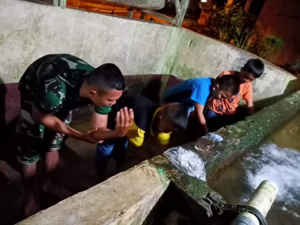Anggota Satgas TMMD ke 111 Kodim 0212/TS, hari terakhir mengajarkan kepada anak anak bagaimana cara berwudhu dengan baik, di Desa Siuhom Kec, Angkola Barat Kab. Tapanuli Selatan