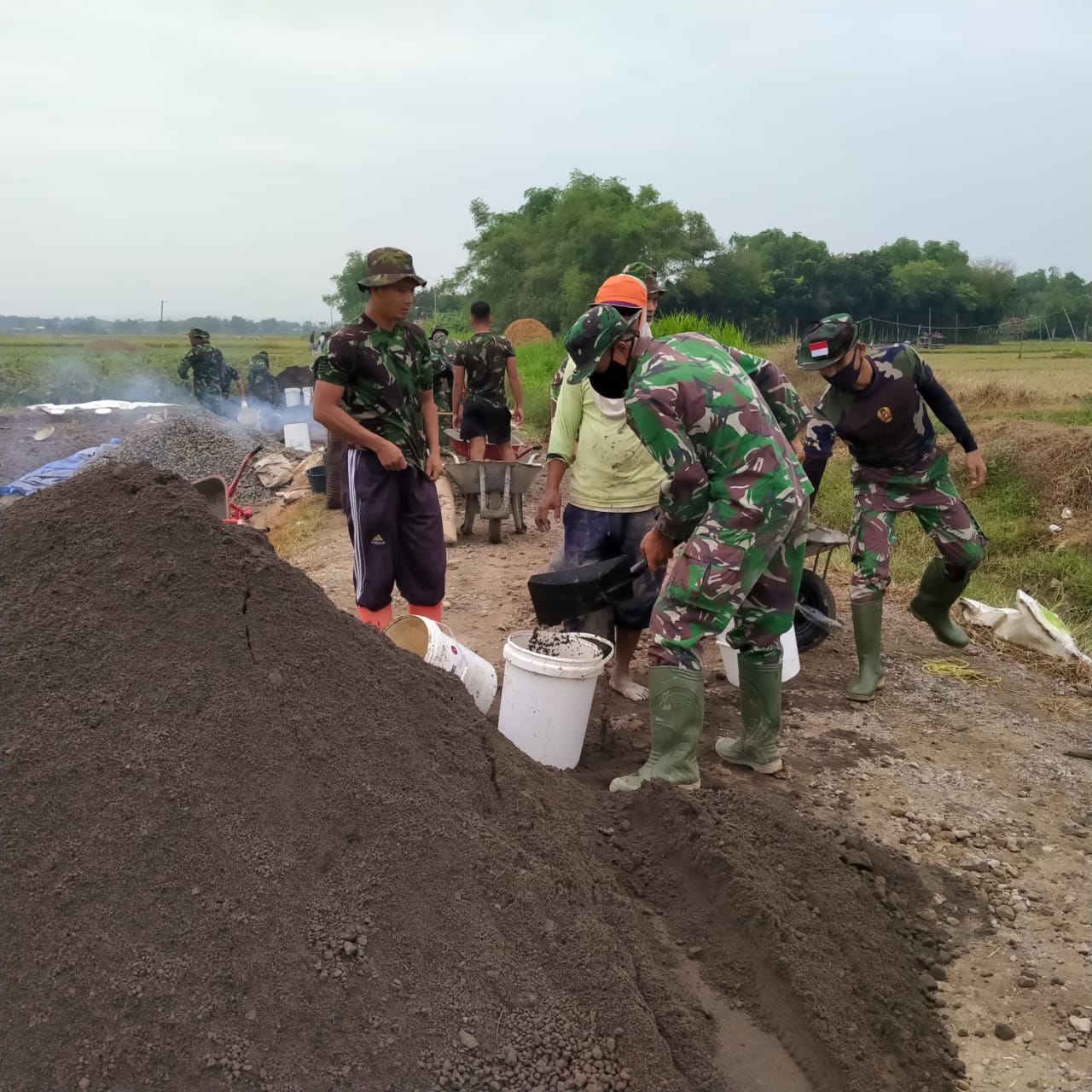 Pati- Program TNI Manunggal Membangun Desa (TMMD) Kodim 0718/Pati di Desa Tamansari pada pembangunan jalan Beton di Desa Tamansari dikebut pembuatannya oleh anggota satuan tugas TMMD dan warga. Minggu,(20/06/2021).