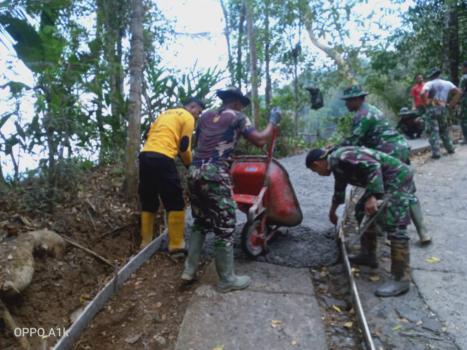 Untuk mempercepat kemajuan pengecoran rabat beton jalan, anggota Satgas TMMD dan warga secara bergantian bekerja keras untuk mengangkut material cor dengan cara manual, menggunakan alat seadanya. Semangat dan kerjasama yang tinggi terlihat dari setiap langkah mereka.