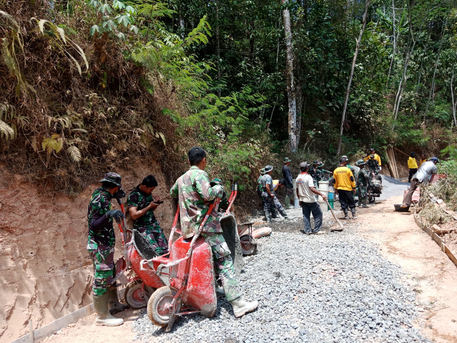 Untuk mempercepat kemajuan pengecoran rabat beton jalan, anggota Satgas TMMD dan warga secara bergantian bekerja keras untuk mengangkut material cor dengan cara manual, menggunakan alat seadanya. Semangat dan kerjasama yang tinggi terlihat dari setiap langkah mereka.