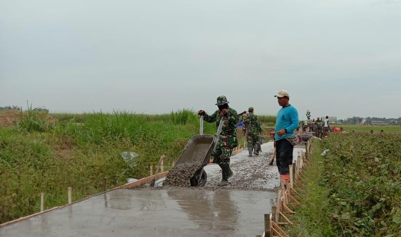 Pati – Kegiatan sasaran fisik program TNI Manunggal Membangun Desa (TMMD) Reguler Ke-111 TA. 2021 Kodim 0718/Pati di Desa Tamansari, Kecamatan Jaken, Kabupaten Pati, sasaran utama berupa pengecoran jalan penghubung Desa Tamansari dengan Desa Sumber Arum sepanjang 1.450 meter, sementara pelaksanaan TMMD baru lima hari sudah mencapai 20 persen pengerjaan. Minghu (20/6/2021)