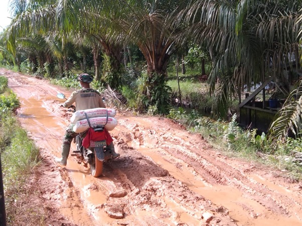 Pratu Marinir Afrizal merupakan anggota Batalyon Marinir XII/Pontianak yang tergabung dalam tim satgas TMMD ke-111 tampak sedang membawa material menggunakan motor dinas dan melewati jalan yang becek. Material semen disimpan disalah satu rumah warga setempat yang berada di ujung jalan masuk yang dibangun.