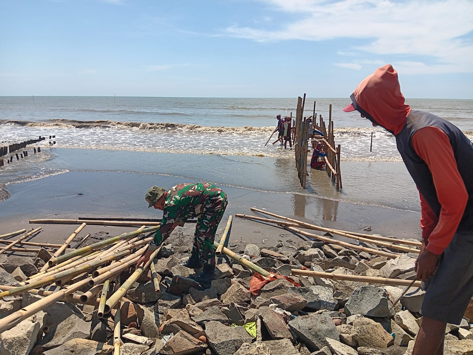 Pasi Ter Kodim 0604/Karawang Lettu Inf Kihajar mengatakan, “Saya melihat warga maupun anggota Satgas TMMD sangat semangat dalam membangun Turap Pemecah Ombak ini”.