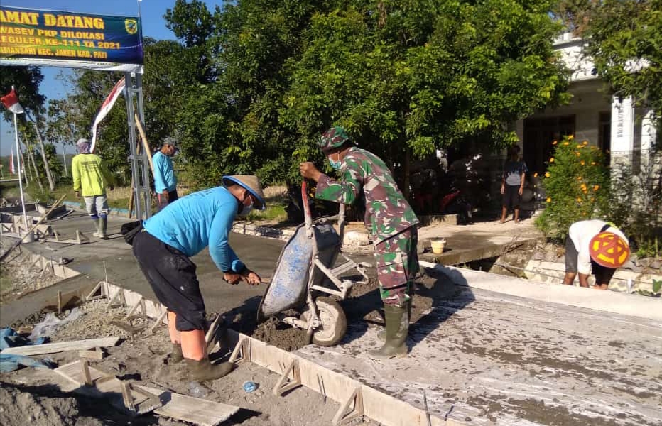 Dalam pengerjaan sejumlah sasaran fisik TMMD Reguler ke-111 Kodim 0718/Pati Tahun anggaran 2021 terbukti dengan adanya gerobak dorong itu cukup ampuh membantu pekerjaan para anggota satgas TMMD dalam percepatan pengecoran jalan. (0718)