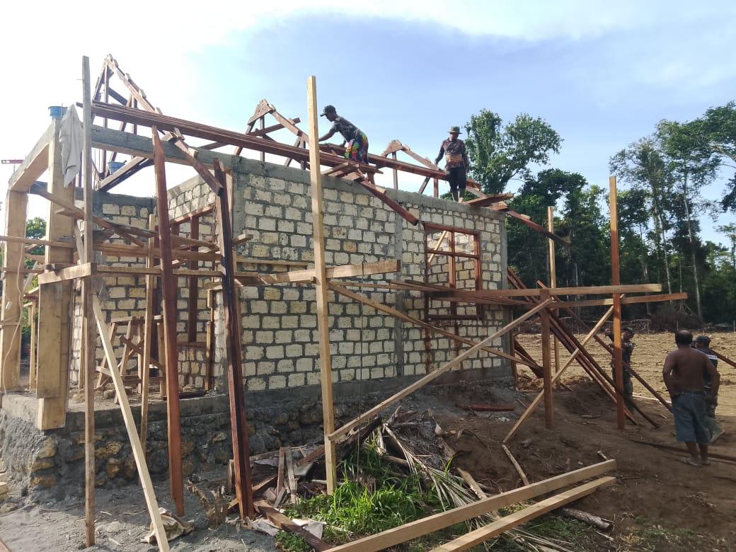 Personel Satgas TMMD ke-123 Kodim 1712/Sarmi bekerja sama dengan warga Kampung Podena untuk memasang rangka atap pada rumah Pastori. Mereka bekerja dengan penuh semangat dan dedikasi, tidak menghiraukan teriknya matahari.