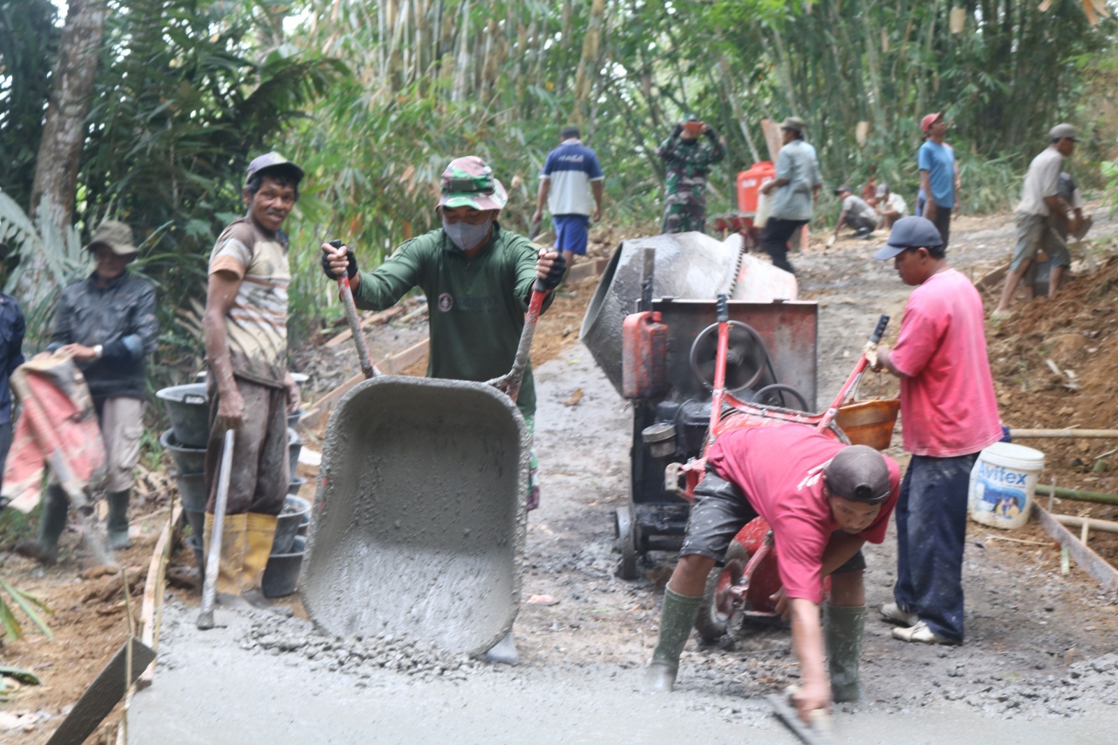 Masing-masing sasaran fisik telah dibagikan pada tiap-tiap kelompok kerja, pada kelompok pengecoran jalan telah mulai dikerjakan sesuai draft yang telah ditentukan. Bagian pengecoran dihari ini semangat gotong royong dilakukan membuat pekerjaan terasa ringan. Seluruh anggota satgas TMMD bersama warga tanpa kenal lelah terus bergerak laksanakan pengecoran jalan.