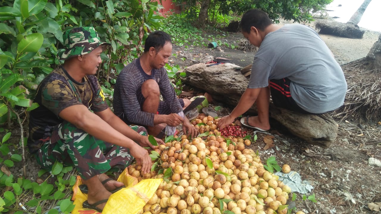 Sembari menunggu bahan materiil, anggota satgas tmmd jg ikut membantu warga panen pala sambil berbincang bincang sekaligus menjalin keakraban dengan warga