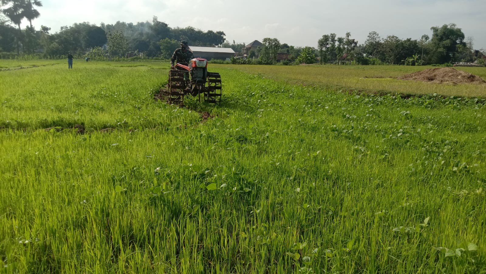 Pemandangan yang tidak seperti biasanya, Serda Arifin terlihat di lokasi dekat dengan pengecoran jalan tampak sedang mengoperasikan mesin traktor (hand traktor) di lahan sawah milik warga, Senin (12/7/2021).