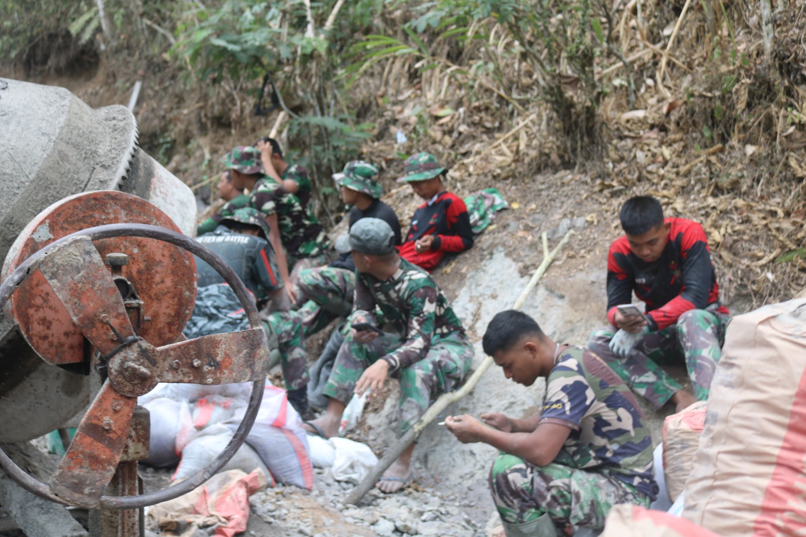 Meski bermandi keringat tampak Satgas TMMD bercerita dan bersenda gurau yang penuh canda dan tawa sambil melepas lelah saat jam istirahat siang.