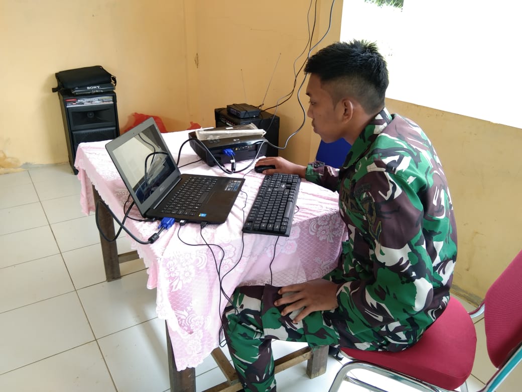 BENGKAYANG – Anggota Satgas TMMD Ke 111 kodim/1202 Singkawang, Serda Galuh Setiawan menyiapkan materi untuk penyuluhan Bela negara dan Wawasan Kebangsaan kepada warga masyarakat Desa Sentangau Jaya Jalan Trans Segorong Kecamatan Seluas Kab Bengkayang.
