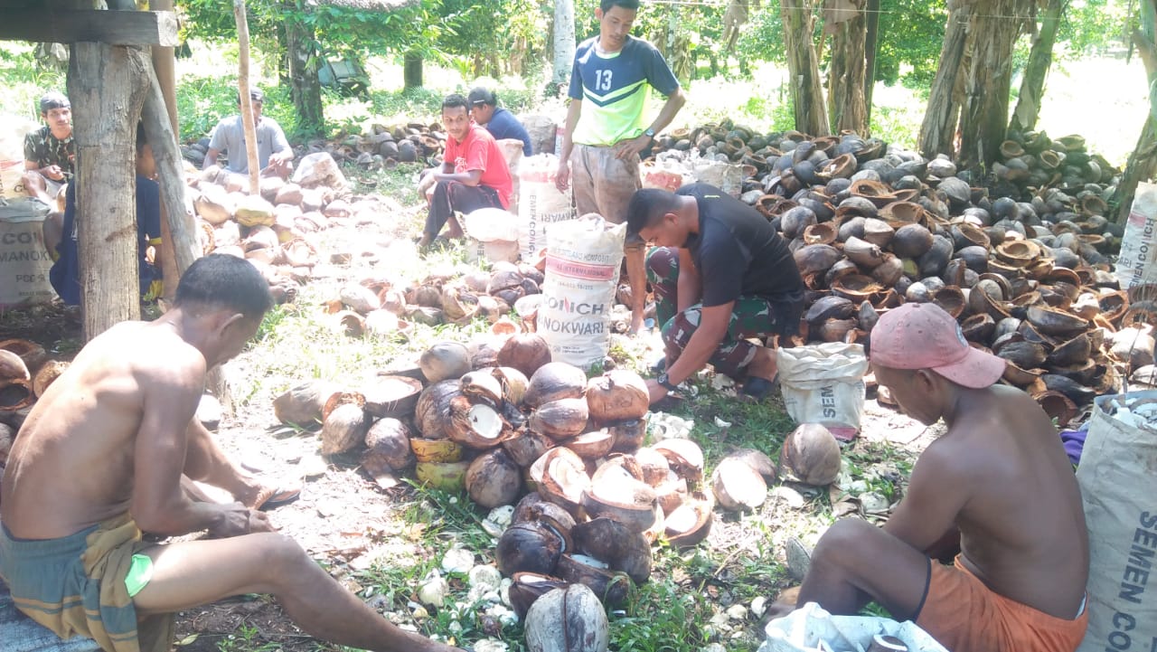 Disela kesibukan terkait kegiatan TMMD yg sangat padat,Serda Husen Yang tidak sengaja menghampiri sekumpulan ibu-ibu & berbincang sambil membantu warga tersebut mengumpulkan Kopra untuk dijadikan minyak kelapa kemudian dijual ke pasar.
