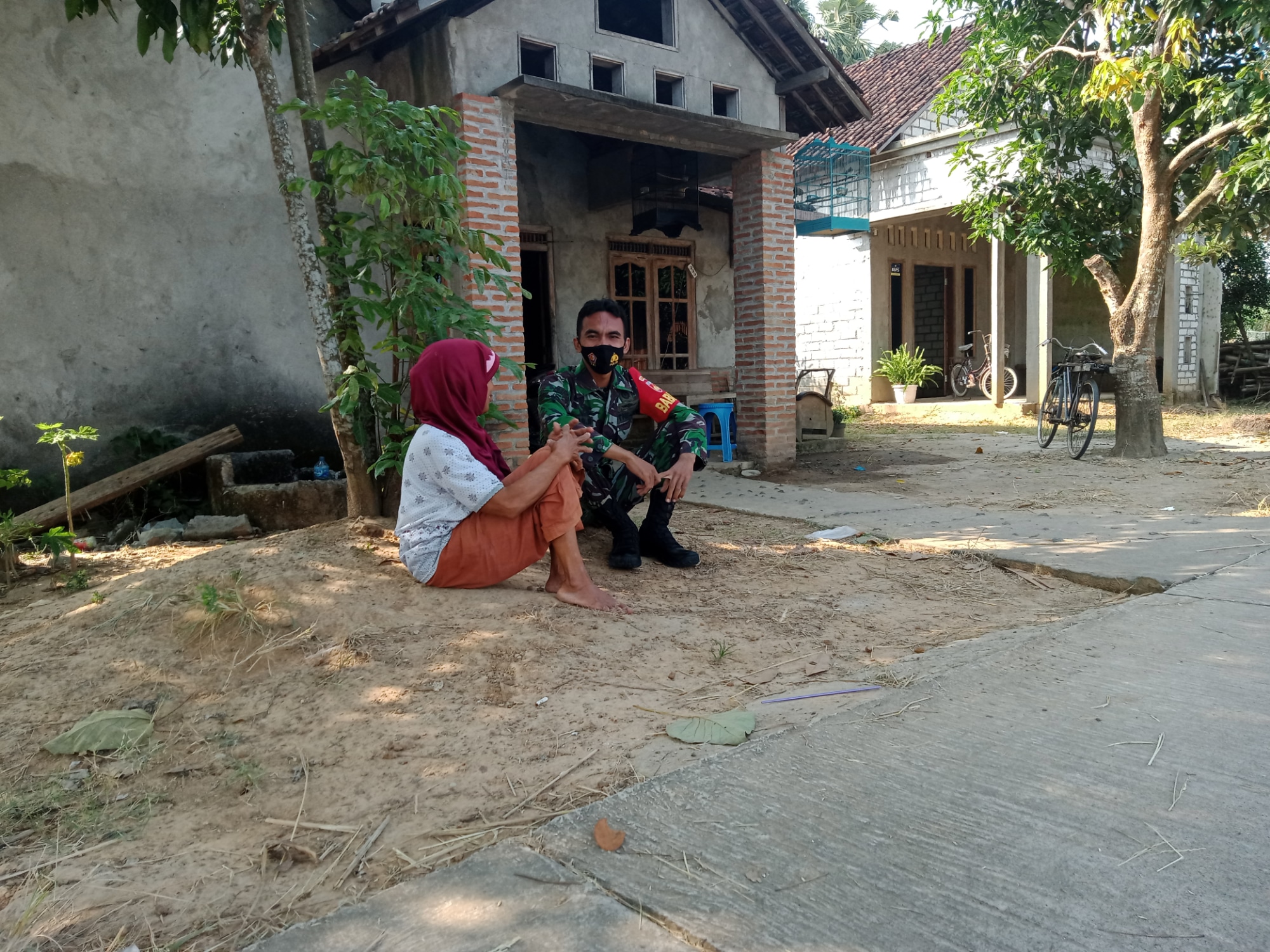Dengan penuh kesabaran, Serda Sukarji memberikan pengertian kepada Nenek Sutinah untuk menggunakan masker saat keluar rumah.
