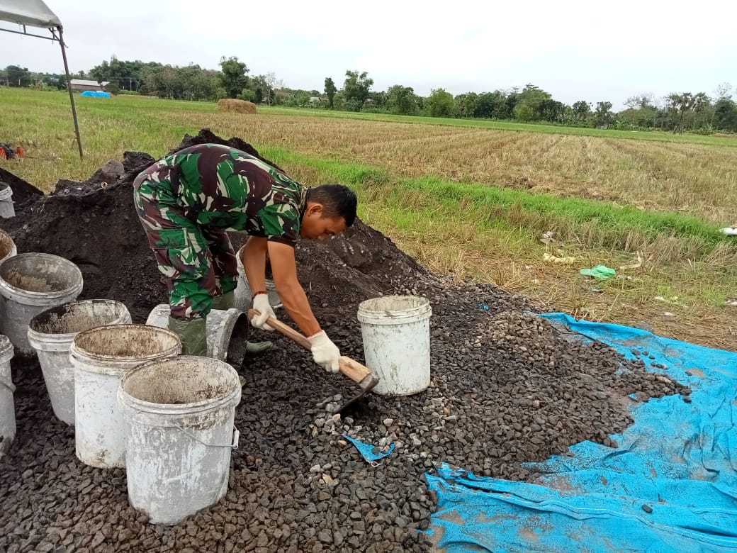 Serka Suwarto salah satu anggota satgas TMMD kebagian penyuplai batu split untuk bahan adonan pembuatan beton, sehingga sehari-hari dia bersama empat orang yang ditunjuk tugasnya adalah membawa batu split ke mesin molen yang siap mengaduk adonan.