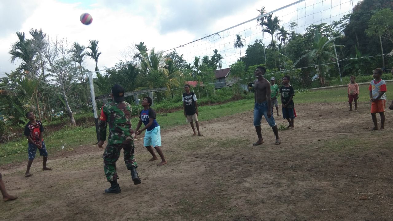 Karena, Babinsa Koramil 1712-02/Pantai Timur, Sertu Agustinus Tusandim mengajak mereka bermain olahraga bola voli. Kendati cuaca terik, mereka tetap bersemangat mengikuti permainan.