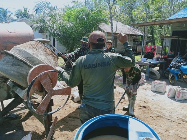 Kubu Raya – Sertu Murni membantu operator mesin molen satgas TMMD ke-111 Kodim 1207/Pontianak di Dusun Maju Jaya, Desa Kuala Mandor B, Kecamatan Kuala Mandor B, Kabupaten Kubu Raya, Minggu (27/06/2021).