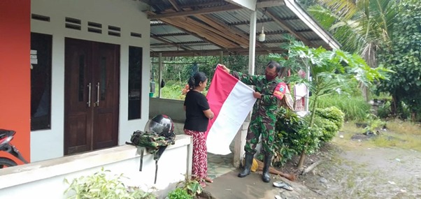 Kubu Raya – Usai sudah pengecoran jalan sepanjang 1.100 meter di Dusun Maju Jaya, Desa Kuala Mandor B, Kecamatan Kuala Mandor B, Kabupaten Kubu Raya. Tampak salah satu anggota satgas TMMD ke-111 Kodim 1207/Pontianak (Sertu Ronisal) memastikan ke masing-masing rumah warga setempat mendapatkan bendera merah putih lengkap dengan tiang dan tapaknya, Sabtu (17/07/2021).
