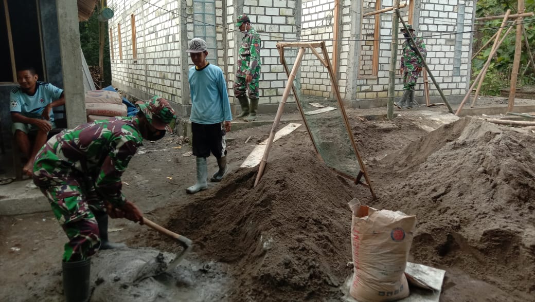 Salah satu anggota satgas TMMD tersebut adalah Sertu Sujadi yang terlihat mahir dalam aduk mengaduk adonan pasir bercampur dengan semen direhab Rumah Tidak Layak Huni (RTLH) milik Suyat (37) warga Dusun Kemiri Rt.04 Rw.01 Desa Tamansari yang menerima bantuan rehab RTLH di program TMMD. Jumat 2/7/2021)