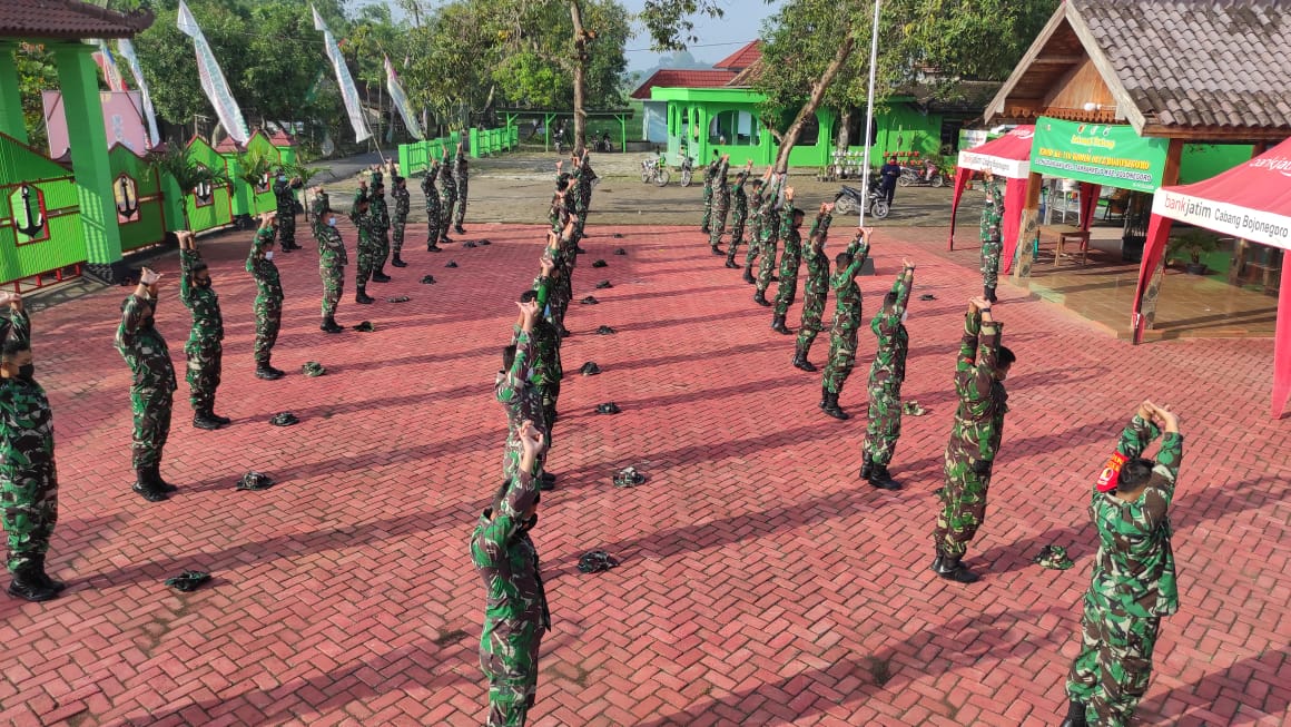 Bojonegoro, – Rutinitas kegiatan pasukan pada kegiatan program TMMD Kabupaten Bojonegoro selalu diawali dengan apel bersama. Dalam pelaksanaanya, Anggota Satgas TMMD Ke- 110 Kodim 0813/Bojonegoro tetap mematuhi protokol kesehatan meskipun sedang beraktifitas. kegiatan yang berlangsung di Balai desa Ngrancang Kecamatan Tambakrejo Kabupaten Bojonegoro tidak lupa protokol kesehatan.
