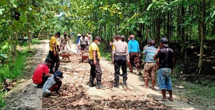 Tampak gugup dan rukun TNI dan Polri melakukan kegiatan pembangunan Jalan di Desa Ngrancang, anggota TNI dan Polri dari Polres Bojonegoro bahu membahu membangun jalan Program TMMD ke 110.