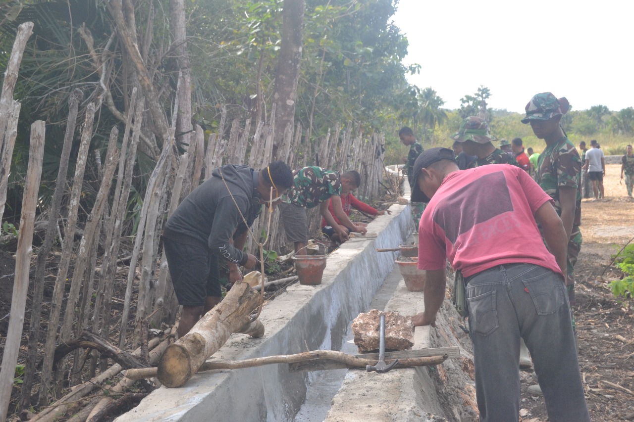 Pelaksanaan TMMD ( TNI MANUNGGAL MEMBANGUN DESA ) ke-111, Kodim 1627/Rote Ndao di Desa Lekona, Kecamatan Pantai Baru, Kabupaten Rote Ndao penuh sukacita dimana antara para personil Satgas dan warga yang saling membantu bekerja di lapangan.