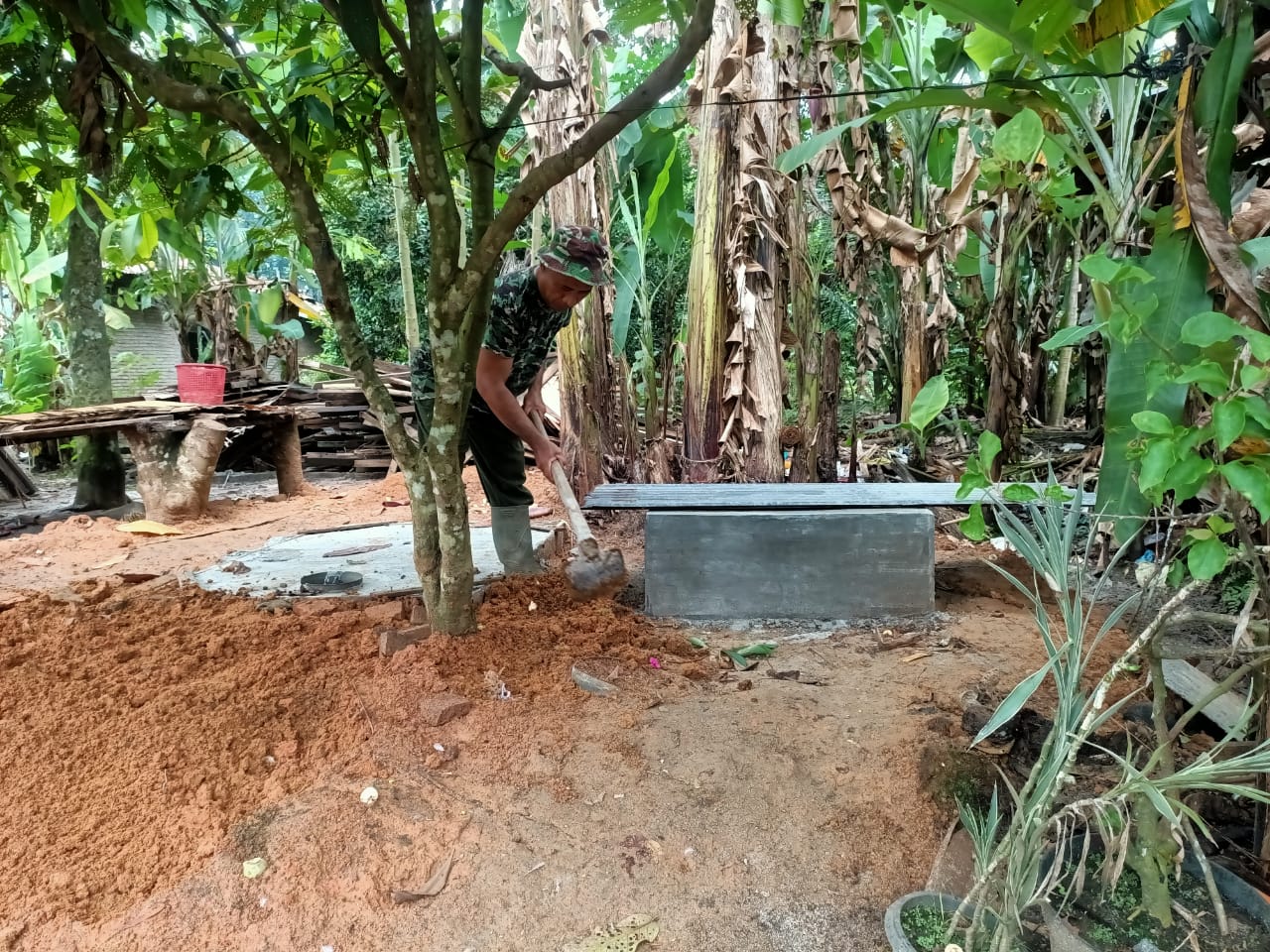Satgas Kodim 0204/DS menggunakan cangkul untuk membersihkan halaman yang masih berserakan. Upaya ini tidak hanya bertujuan memperindah tampilan, tetapi juga memastikan lingkungan rumah menjadi sehat dan nyaman bagi Ibu Turini dan keluarganya.