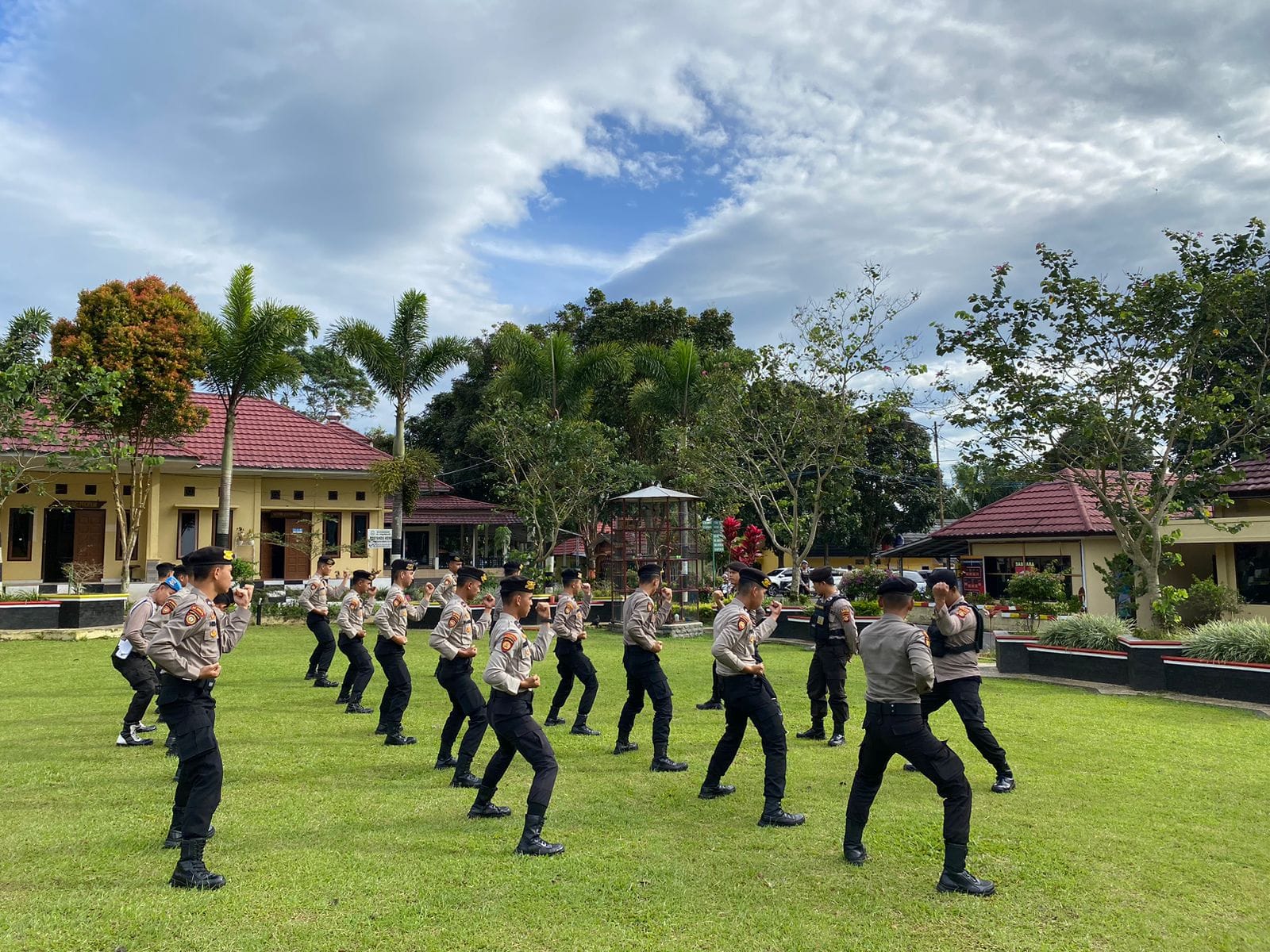 Berkisar satu pleton personel Sat Samapta yang terdiri dari bintara remaja mengikuti latihan seni beladiri Jujitsu yang dipimping Kanit PAM Obvit Aipda Guntur.