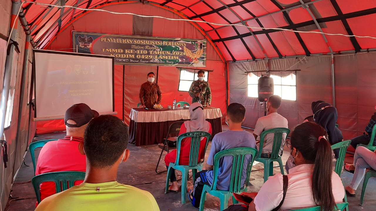 Lampung Timur, TNI Manunggal Membangun Desa (TMMD) Ke-110 Kodim 0429/Lamtim kembali melaksanakan kegiatan sasaran non fisik, yakni dengan menggelar penyuluhan bahaya terorisme dan radikalisme, bertempat di balai Desa Sukorahayu, Labuhan Maringgai, Sabtu (27/3/2021).