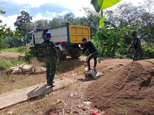 “Kami ikut mengarahkan bongkar material, agar peletakan material bisa merata sesuai kebutuhan sepanjang lokasi perbaikan jalan” ungkap Serda Ronisal.