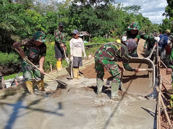“Kita seluruh anggota satgas bersama warga bahu membahu mengerjakan pengecoran jalan. Saya harus bisa memberikan contoh dan semangat kepada warga masyarakat dengan tujuan agar dapat memotivasi kerja mereka” pungkas Sertu Sugiyanto.