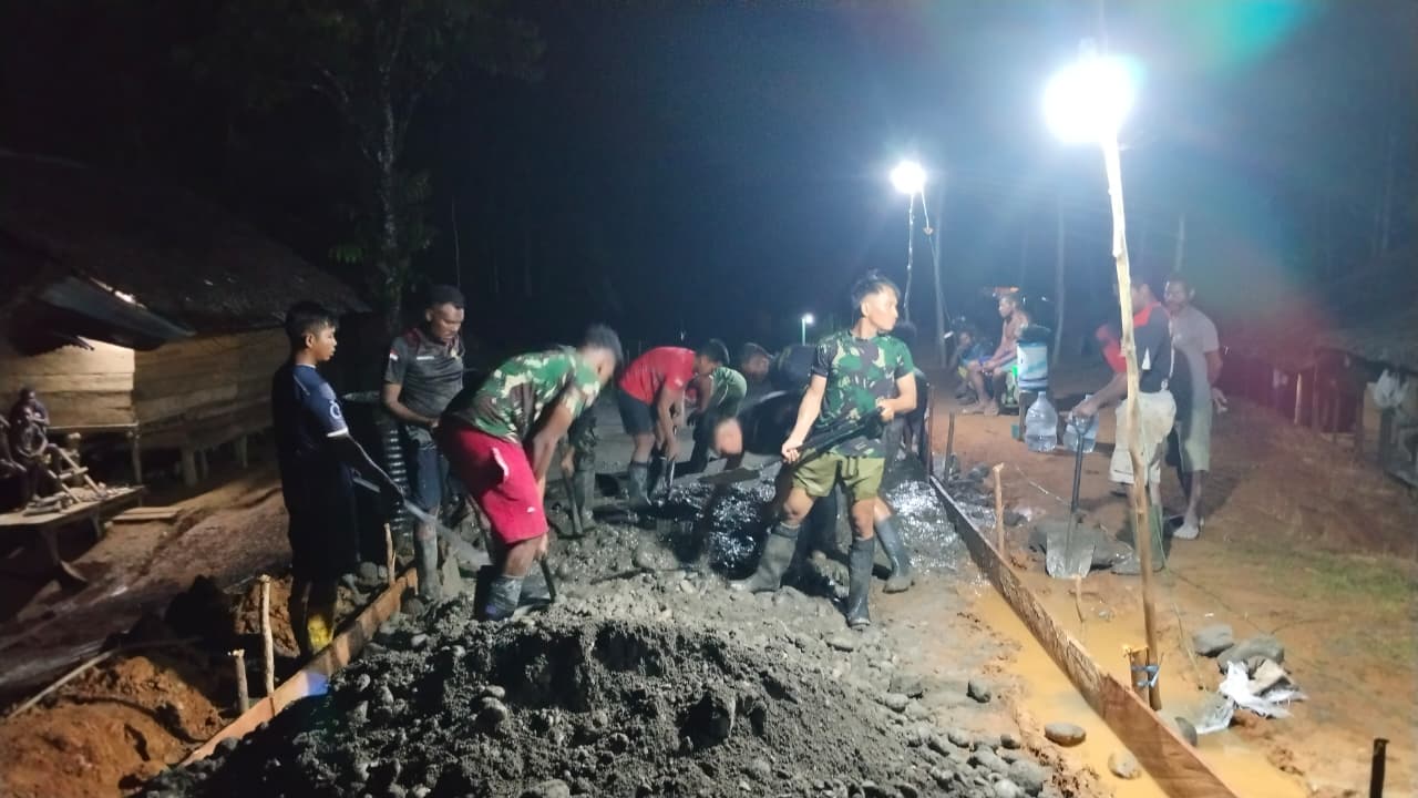 Aktivitas pengecoran terlihat padat pada Selasa (21/10/2025), melibatkan prajurit TNI bersama masyarakat setempat. Pengerjaan ini disambut antusias oleh warga karena jalan yang dicor merupakan akses vital bagi mereka.