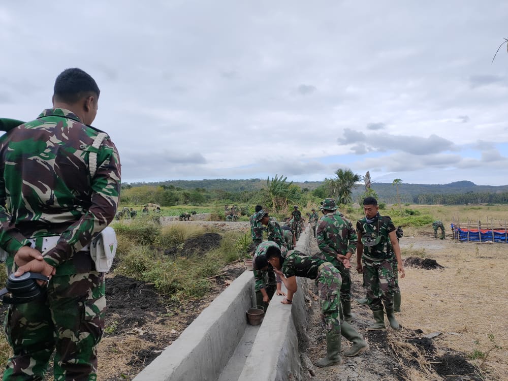 Walaupun berada dibawah terik matahari, namun sejumlah anggota Satgas TMMD dan masyarakat bahu membahu untuk melanjutkan pengecoran lantai setiap hari, Dengan penuh semangat warga masyarakat dan satgas mengebut target pembuatan irigasi yang merupakan sasaran dalam kegiatan TMMD ke 111 Pantai Baru.dan tidak sedikitpun yang membuat mereka pata semangat dalam bekerja.