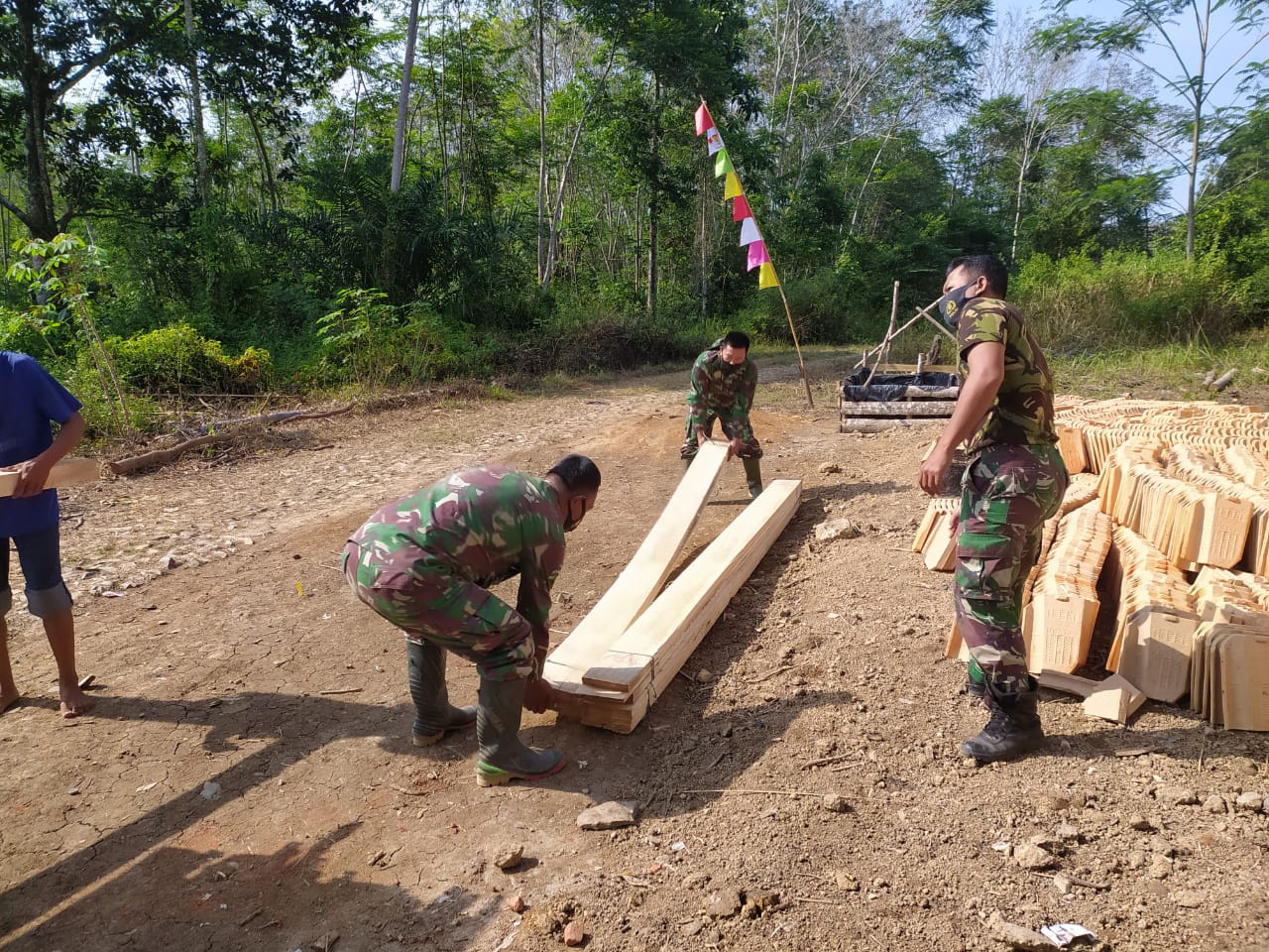 WAY KANAN – Anggota pra TMMD ke 111 Kodim 0427/Way Kanan menerima dorongan bahan material kayu guna melengkapi kekurangan bahan dalam pembangunan RTLH milik Ibu Densi di Dusun Talang Padang Kampung Umpu Semenguk Kabupaten Way Kanan. Kamis (10/6/2021)
