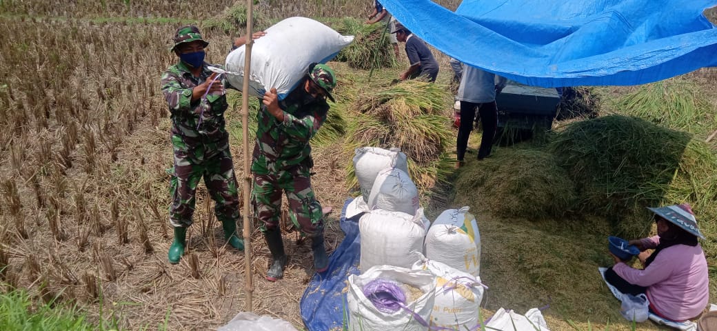 Bojonegoro – Kopda Anang dan Serda Sugianto Anggota Satgas TMMD ke-110 Kodim/Bojonegoro membantu mengangkut gabah hasil panen milik pak Sulis warga masyarakat Desa Jatimulyo, Selasa (23/3/2021).