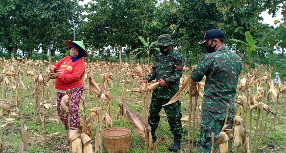 BOJONEGORO – Terjun langsung ke sawah, Satgas TNI Manunggal Membangun Desa (TMMD) ke 110 Kodim 0813/Bojonegoro bantu warga panen jagung.