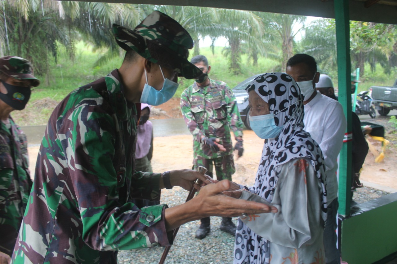 Penyerahan rumah layak huni diserahkan langsung oleh Dandim 1009/Tla yang juga sebagai Dansatgas TMMD ke-111 tahun 2021 Letkol Inf Adi Yoga Susetyo, SH., M.A. didampingi Danramil 1009-03/Bati-bati Kapten Inf Supriyanto selaku penanggung jawab dalam pembangunan rumah ibu Arbaiyah.