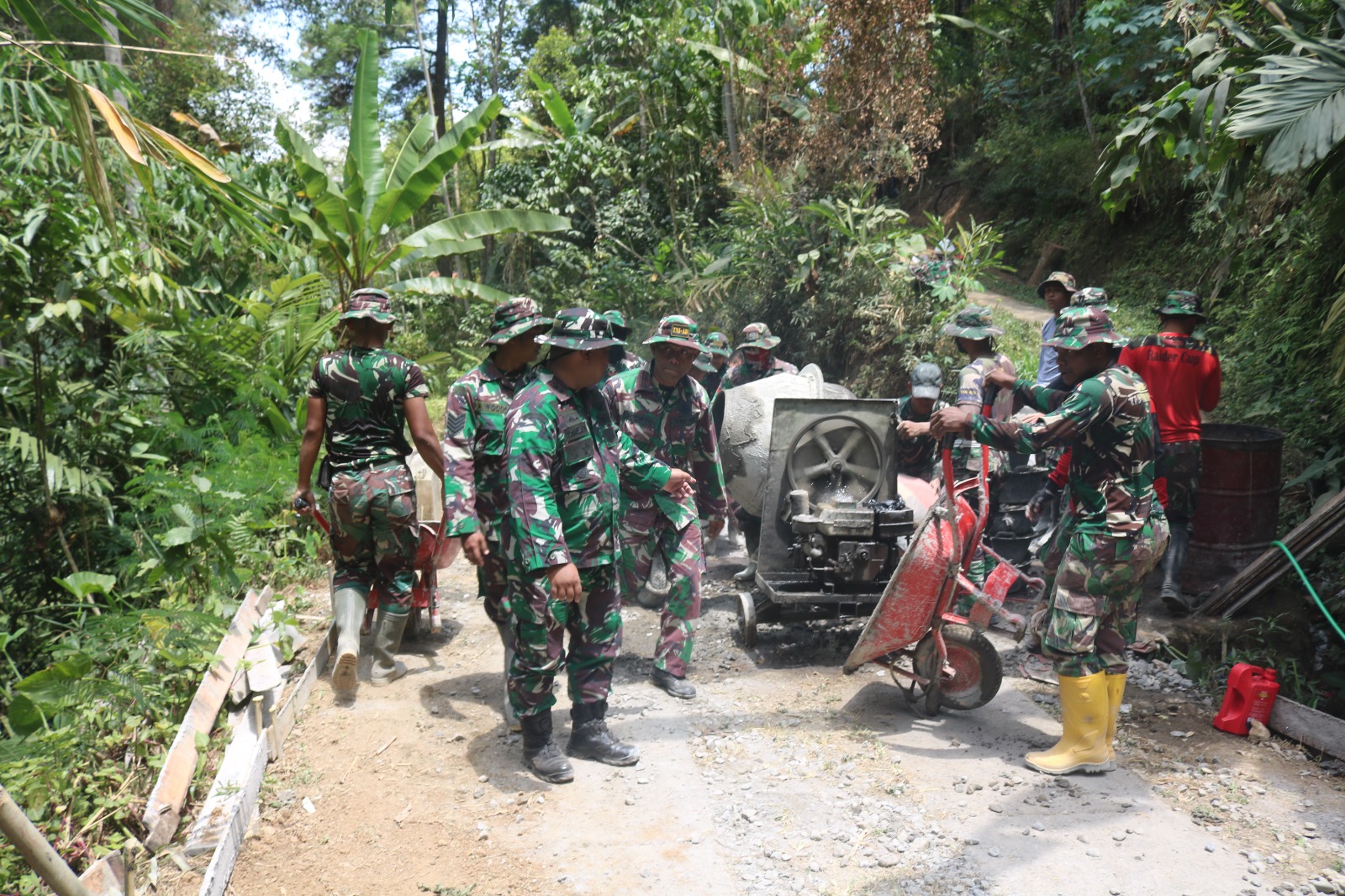 “Untuk melihat secara langsung situasi dan kondisi, baik pengerjaan fisik maupun non fisik, kami sengaja turun langsung, untuk membantu anggota Satgas dan warga dalam pengecoran, secara otomatis akan memberikan motivasi dan semangat tersendiri bagi mereka. Pasalnya setelah beberapa Minggu bekerja mungkin akan muncul rasa lelah dan bosan. Tujuan dari turun kelapangan ini, agar menjadi penyemangat dan mereka pulih kembali,” kata Dandim.
