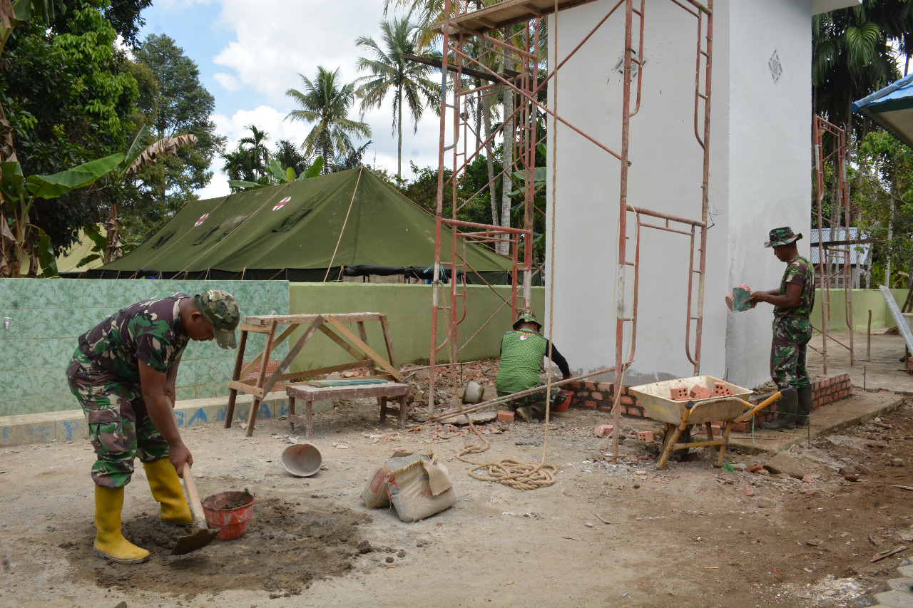 Di kerjakan secara gotong royong, Satgas TMMD bersama warga saling berkerja sama selesai target sasaran pembangunan fisik TMMD renovasi masjid Nurul Imam.