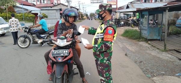 Pontianak – Upaya pencegahan penyebaran covid-19 terus dilakukan oleh Babinsa Kelurahan Tanjung Hilir, Sertu M. Rubai beserta Bhabinkamtibmas dan Lurah Tanjung Hilir. Salah satunya dengan cara membagikan masker secara gratis kepada masyarakat Tanjung Hilir. Jumat (04/06/2021)