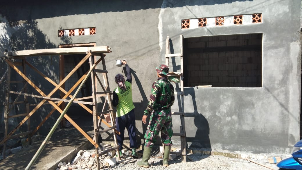 Pati – Perkembangan rehab Rumah Tidak Layak Huni (RTLH) program TMMD Reguler Ke – 111 Kodim 0718/ Pati milik Mudadi (42), di Desa Tamansari,Rt 02 Rw 02 Kecamatan Jaken, Kabupaten Pati, Jawa Tengah, di hari ke-23 pelaksanaan TMMD pengacian dinding dan melanjutkan plester lantai yang dikerjakan salah satu anggota Satgas TMMD dan warga. Rabu (07/07/2021).