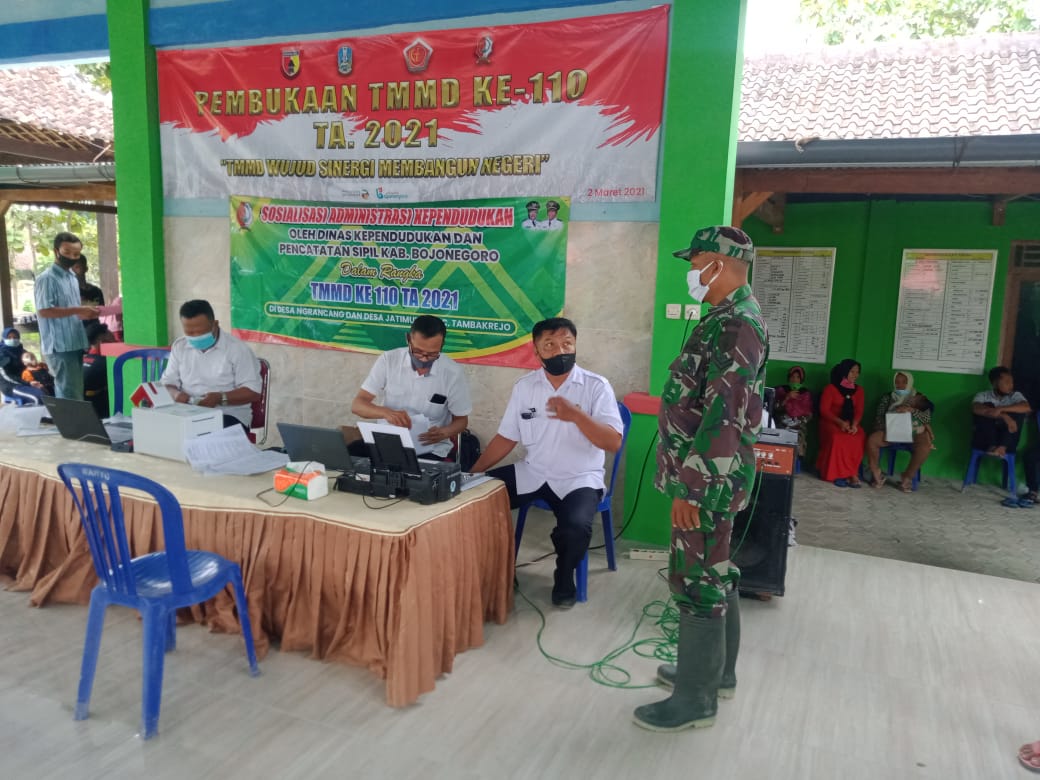 Bojonegoro, Anggota TMMD ke-110 Kodim 0813/Bojonegoro melakukan koordinasi bersama Dinas Kependudukan dan Catatan Sipil (Disdukcapil) Kabupaten Bojonegoro untuk melancarkan acara sosialisasi.
