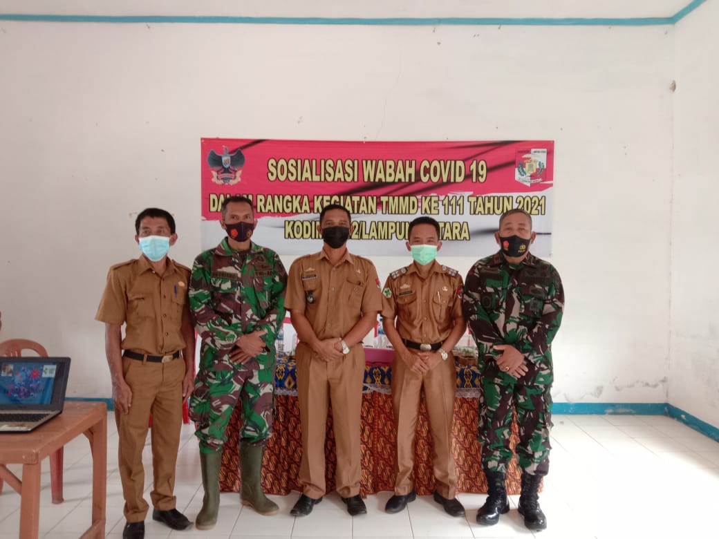 Sosialisasi Bahaya Wabah Covid-19 dalam rangkaian Non Fisik TMMD ke 111 Kodim 0412/LU bertempat di Desa Sumber Arum, Kotabumi- Lampung Utara yang dihadiri oleh Dandim 0412/LU yang diwakili oleh Danramil 412-06/Sungkai Utara Lettu Inf Basrudin. dr. Dian Mauli, M.H, Sp,. KKLP. (Spesialis Dokter Keluarga) Ns. Eva Karmila Sari, S. Kep, M.Kes. Babinsa Sumber Arum, Peltu Suloko, Kades Sumber Arum Bapak Bintoro, Perangkat Desa lainya dan Masyarakat Sumber Arum Selasa, 22/06/2021