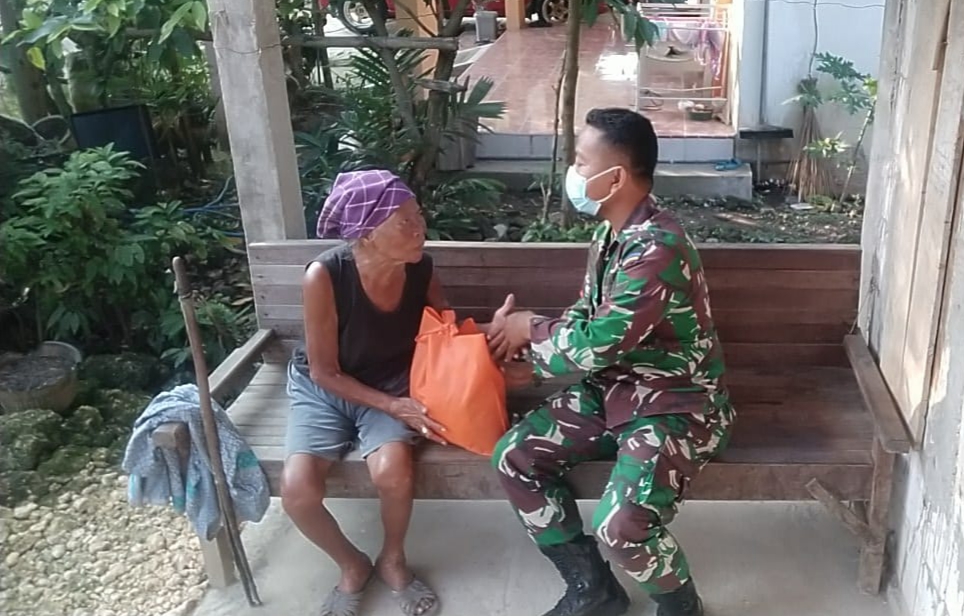 Seperti terlihat Sertu Sarno anggota Satgas TMMD Reguler Kodim Pati sedang menyerahkan bingkisan paket sembako dari Kodim Pati kepada Mbah Kasiyah (70) warga RT.04/01 Desa Tamansari, Kecamatan Jaken, Kabupaten Pati, Kamis (01/7/2021). Kasiyah adalah janda yang tergolong warga tidak mampu, itu yang menjadi alasan Satgas TMMD untuk diberikan bantuan paket sembako.