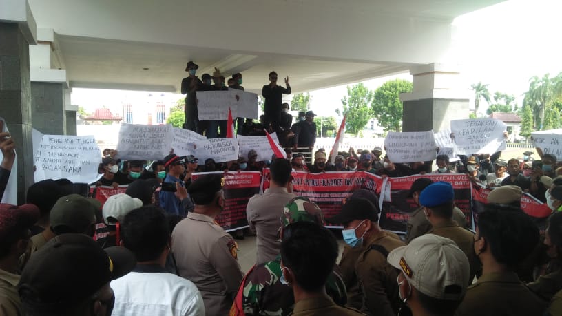 Kliksumatera.com, KAYUAGUNG– Ratusan warga yang menamakan diri sebagai Aliansi Masyarakat Peduli Pilkades menyeggel Kantor Dinas Pemberdayaan Masyarakat Desa (DPMD) Kabupaten Ogan Komering Ilir (OKI), Senin (08/11).