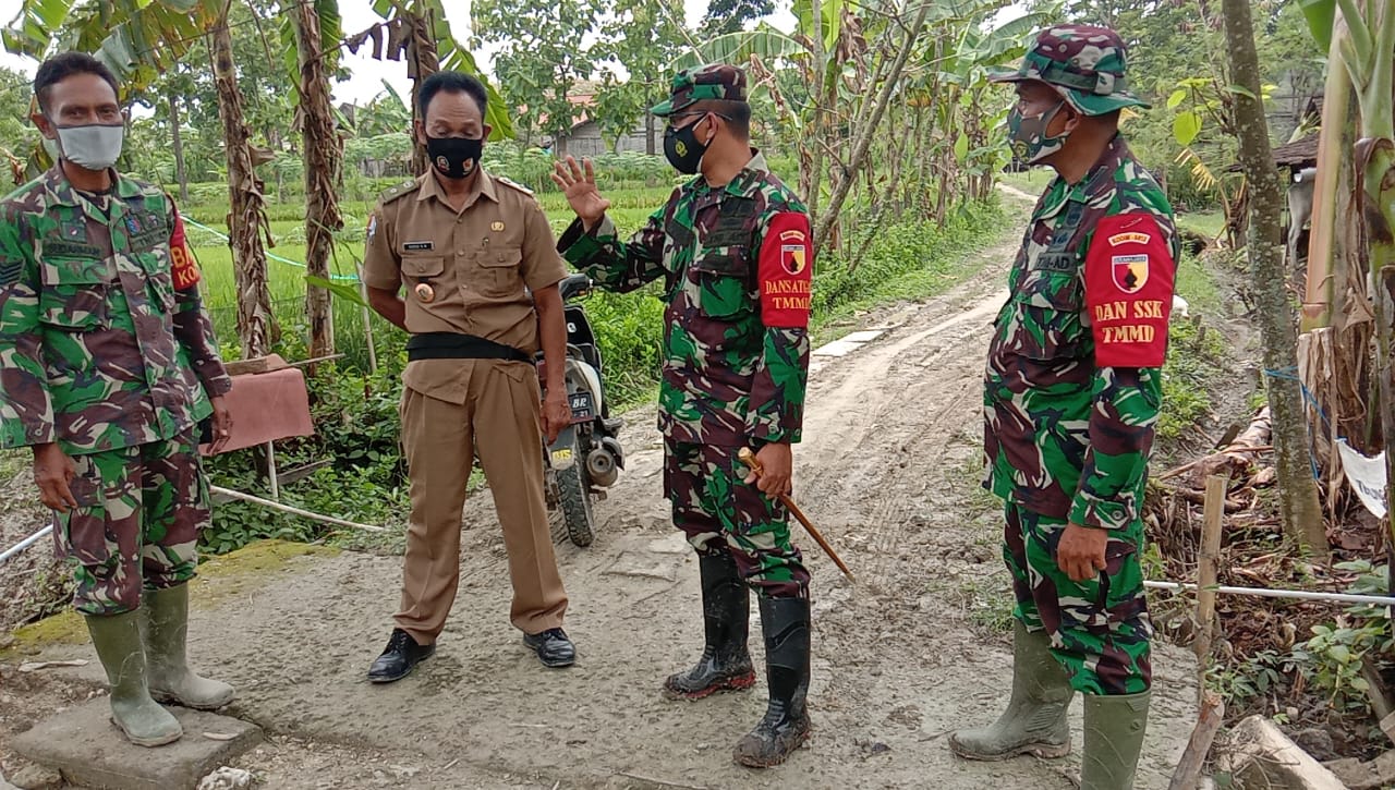 Dansatgas TMMD ke-110 Letkol Inf Bambang Hariyanto, didampingi perangkat Desa beserta Kadesnya, melihat anggota Tim Satgas TMMD ke-110 membuat drainase di pinggir jalan yang sedang dilakukan program pengaspalan.