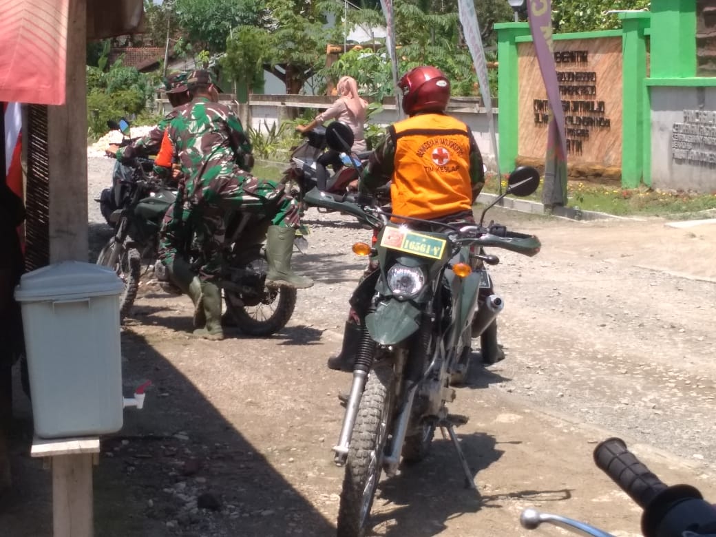 Terlihat anggota satgas TMMD ke-110 Kodim 0813/Bojonegoro Peltu Zaenal, Tim Kesehatan dan juga Dan SSK Lettu Ckm Suroto menuju anggota satgas TMMD ke-110, Kamis(18/3/2021).